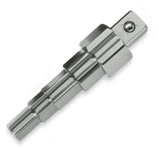 The tool features a 1/2" square drive and provides cam, internal hexagon, and 12-edged (double hexagon) fittings to cover multiple common sizes — giving you one compact solution for a range of valve and tap applications. For quicker work, it’s compatible with a 1/2" ratchet, allowing smooth, efficient turning in confined spaces.