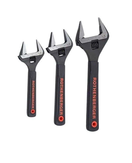 The Rothenberger Wide Jaw Wrench range is a new set of extra wide opening adjustable wrenches designed for professional use in tight and awkward working areas. Each wrench features a slimline, angled jaw profile, making it easier to grip larger nuts and fittings when space is limited—ideal for plumbing, heating, and general maintenance work.
