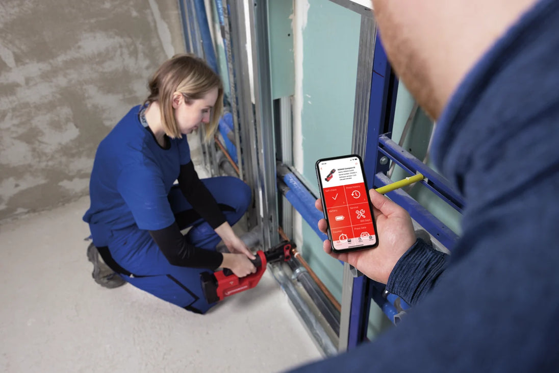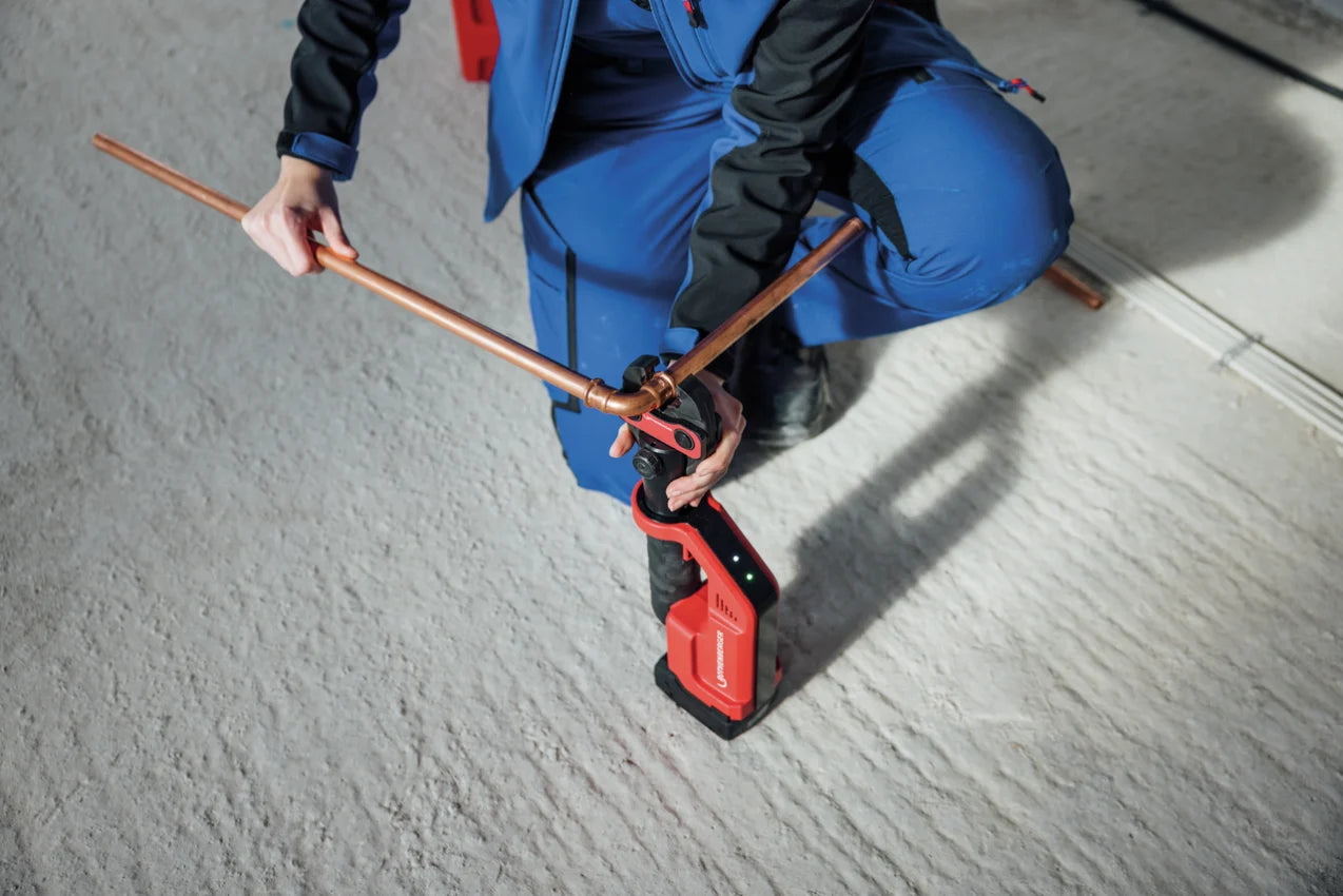 Designed for modern trade workflows, the ROMAX COMPACT III includes an emergency stop button for immediate shutdown, LED status indicators for battery/tool feedback, and Bluetooth connectivity for monitoring and tool management via the Rothenberger app.